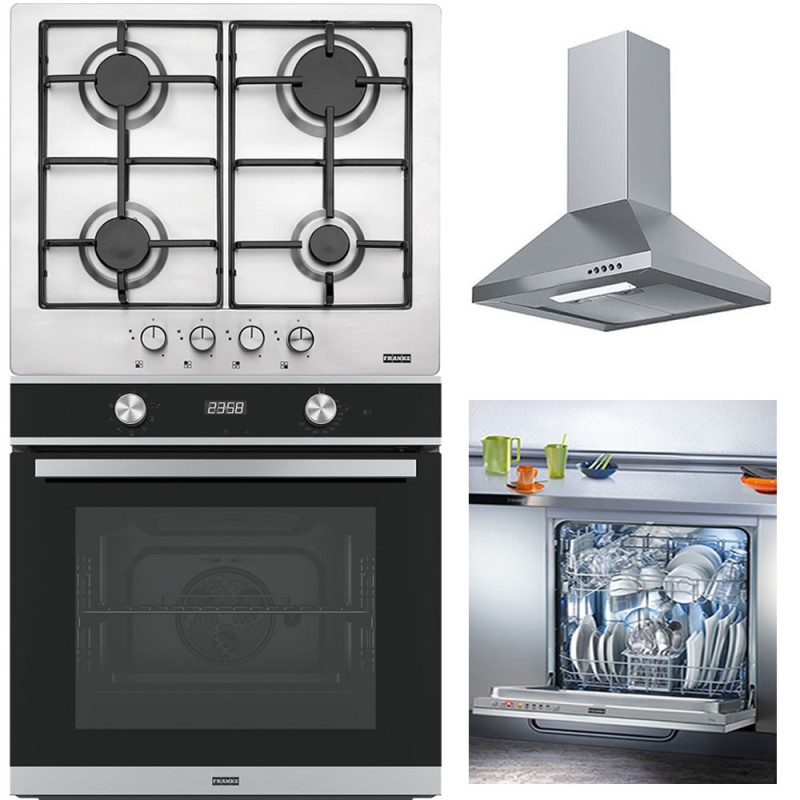 Cuptor electric inox si sticla neagra, afisaj digital, capacitate 71 litrii, 8 functii, inchidere amortizata, comenzi mecanice, ventilator, program paine, turbo grill, curatare Aquaclean + Plita pe gaz inox, 4 arzatoare, gratare email, aprindere electrica, siguranta, latime 60cm + Hota de perete inox, putere de absorbtie 410 (mc/h), iluminare LED, latime 60cm + Masina de spalat vase incorporabila, latime 60cm, capacitate 14 seturi, 5 programe, sistem anti-inundatie