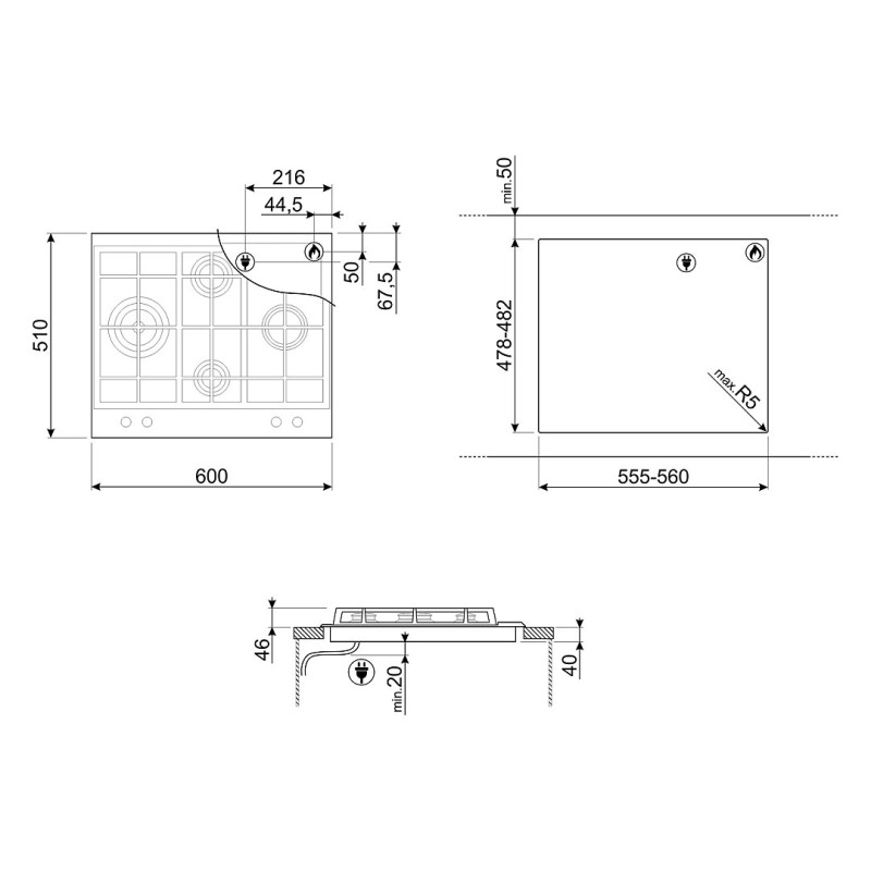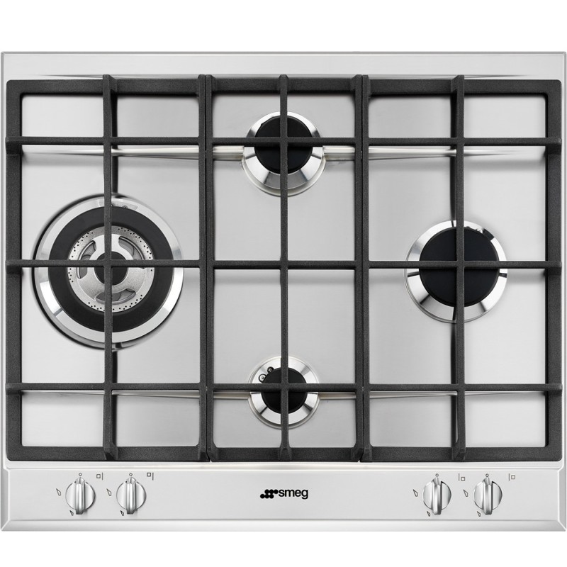 Plita incorporabila pe gaz Smeg, 4 arzatoare, arzator WOK (dublu), gratare din fonta, 4 butoane frontale, siguranta, aprindere electrica