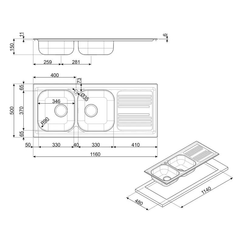 Dimensiunea decupajului montare în partea de sus (mm): 1140 x 480 mm