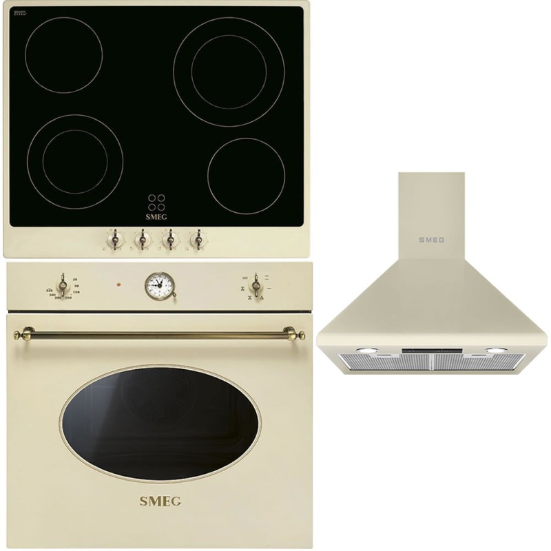 Completează bucătăria cu pachet Smeg electric crem: cuptor electric incorporabil multifuncțional cu convecție și email ușor de curățat, plită vitroceramică cu 4 zone și butoane din alamă pentru control precis, plus hotă de perete crem cu filtre lavabile și iluminare LED. Set cuptor, plită și hotă Smeg Italia – electrocasnice incorporabile premium, eficiente și silențioase, cu design retro elegant pentru bucătărie modernă. Alege pachet Smeg crem, cuptor electric incorporabil, plită electrică, hotă de perete – montaj ușor, calitate și stil.