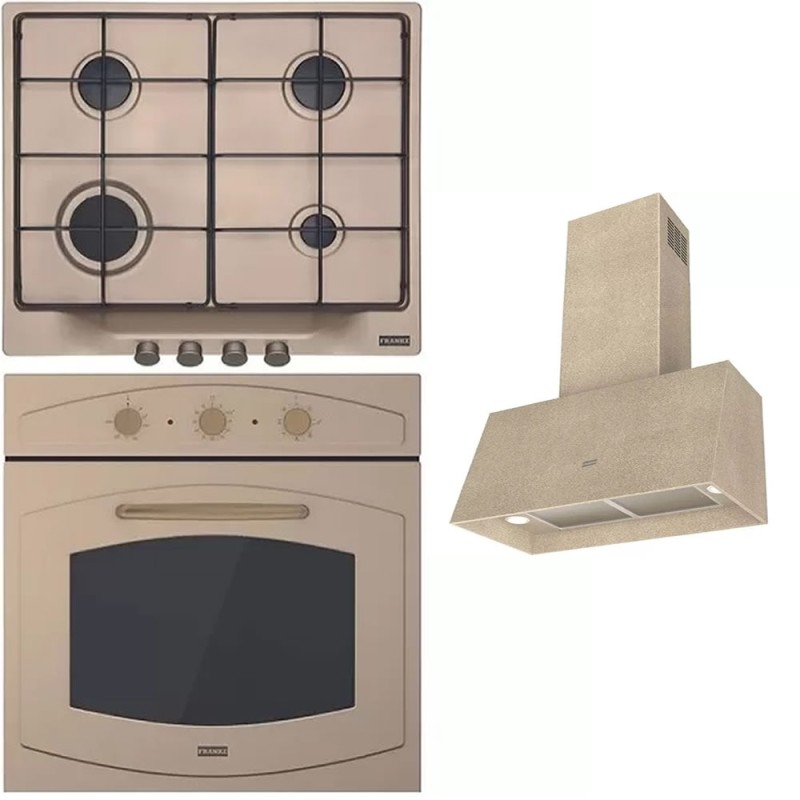 Cuptor incorporabil electric Franke, capacitate 65 litrii, 8 functii, clasa energetica A, control mecanic, ventilator, grill, curatare cu aburi, butoane si manere auriu antichizat, culoare avena + Plita incorporabila pe gaz Franke, 4 arzatoare, aprindere electronica din buton, siguranta copii, gratare email, control frontal, butoane de culoare auriu antichizat, culoare avena + Hota cu prindere pe perete Franke, putere mare de absortie 600 (mc/h), latime 70 cm, iluminare LED 2X1W, filtre aluminiu, diametru tub evacuare 150 mm, culoare avena