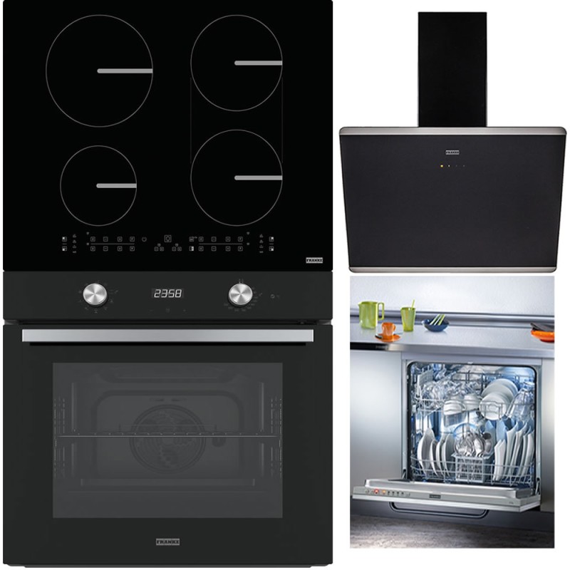 Cuptor electric inox si sticla neagra, afisaj digital, capacitate 71 litrii, 8 functii, inchidere amortizata, comenzi mecanice, ventilator, program paine, turbo grill, curatare Aquaclean + Plita cu inducție asigură încălzire rapidă, siguranță și eficiență energetică, cu suprafață vitroceramică ușor de întreținut și zone flexibile pentru diverse tipuri de vase + Hota de perete sticla neagra, putere de absorbtie (730mc/h), 60cm, evacuare 150mm cu reductie 120mm, (posibilitate adaugare filtre de carbon fara a mai scoate burlan afara) + Masina de spalat vase incorporabila, latime 60cm, capacitate 14 seturi, 5 programe, sistem anti-inundatie