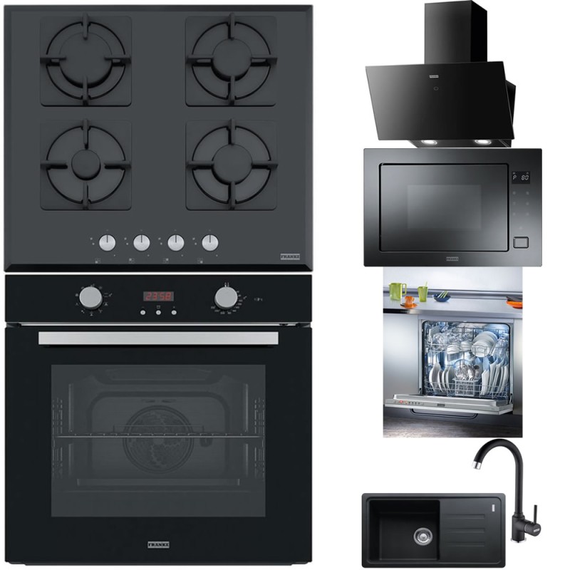 Cuptor electric incorporabil sticla neagra, 8 programe, capacitate 71 litrii, 5 niveluri de gatit, afisaj digital rosu, ghidaje lateral cromate, iluminare, ventilator, curatare Aqua Clean, butone argintii, finisaj sticla neagra + Plita pe gaz incorporabila, 4 arzatoare, suprafata vitroceramica sticla neagra, gratare fonta, siguranta, aprindere electrica, 60cm + Hota de perete sticla neagra, putere de absorbtie 580 (mc/h), latime 60cm, diametru tub evacuare 150mm (posibilitate adaugare filtre de carbon fara a mai scoate burlan afara), garantie 3 ani + Set Franke chiuveta incorporabila cu 1 cuva si picurator, dimensiuni 780x435mm, adancime cuva 200mm, accesorii montaj incluse, antibacterian, garantie 15 ani + Baterie monocomanda, cartus ceramic, pipa inalta curbata, cap fix, garantie 2 ani + Cuptor cu microunde incorporabil, capacitate 25 litrii, 7 functii, sticla neagra, afisaj digital, grill + Masina de spalat vase incorporabila, capacitate 14 seturi, display, latime 60cm, 5 programe de spalare, program rapid, filtru metalic, 2 cosuri, garantie 3 ani