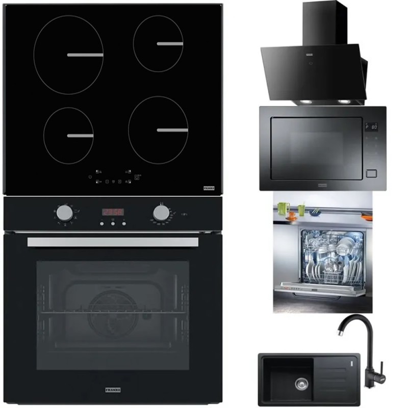Cuptor electric incorporabil sticla neagra, 8 programe, capacitate 71 litrii, 5 niveluri de gatit, afisaj digital rosu, ghidaje lateral cromate, iluminare, ventilator, curatare Aqua Clean, butone argintii, finisaj sticla neagra + Plita electrica inductie incorporabila, 4 zone de gatit, suprafata vitroceramica neagra, siguranta copii, putere totala 7200W, latime 65cm + Hota de perete sticla neagra, putere de absorbtie 580 (mc/h), latime 60cm, diametru tub evacuare 150mm (posibilitate adaugare filtre de carbon fara a mai scoate burlan afara), garantie 3 ani + Set Franke chiuveta incorporabila cu 1 cuva si picurator, dimensiuni 780x435mm, adancime cuva 200mm, accesorii montaj incluse, antibacterian, garantie 15 ani + Baterie monocomanda, cartus ceramic, pipa inalta curbata, cap fix, garantie 2 ani + Cuptor cu microunde incorporabil, capacitate 25 litrii, 7 functii, sticla neagra, afisaj digital, grill + Masina de spalat vase incorporabila, capacitate 14 seturi, display, latime 60cm, 5 programe de spalare, program rapid, filtru metalic, 2 cosuri, garantie 3 ani