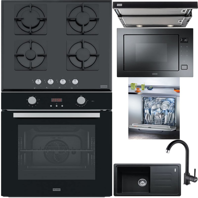 Cuptor electric incorporabil sticla neagra, 8 programe, capacitate 71 litrii, ghidaje lateral cromate, iluminare, ventilator, curatare Aqua Clean + Plita pe gaz incorporabila, 4 arzatoare, suprafata vitroceramica sticla neagra, gratare fonta, siguranta, aprindere electrica, 60cm + Hota telescopica, front sticla neagra, putere de absorbtie 380 (mc/h), iluminare LED, evacuare 120mm (posibilitate adaugare filtre de carbon fara a mai scoate burlan afara) + Cuptor cu microunde incorporabil Franke, capacitate 25 litrii, 7 functii, programator electronic cu display touch control, grill, decongelare, blocare copii, finisaj sticla neagra + Masina de spalat vase total incorporabila, capacitate 14 seturi, 5 programe, afisaj led, soft touch + Set Franke chiuveta incorporabila cu 1 cuva si picurator, dimensiuni 780x435mm, adancime cuva 200mm, accesorii montaj incluse, antibacterian, garantie 15 ani + Baterie monocomanda, cartus ceramic, pipa inalta curbata, cap fix, garantie 2 ani