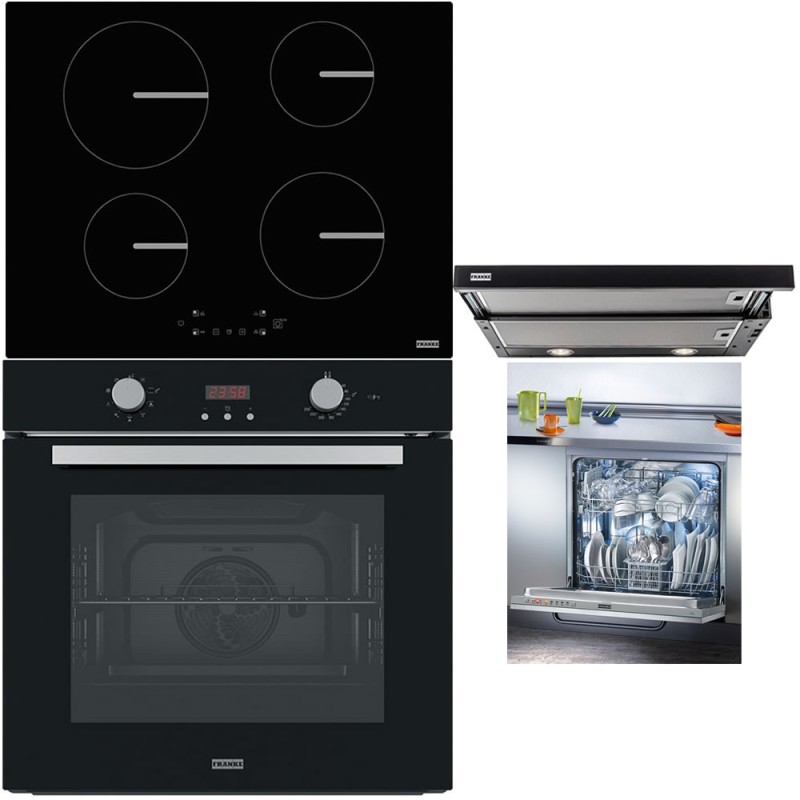Cuptor electric incorporabil sticla neagra, 8 programe, capacitate 71 litrii, ghidaje lateral cromate, iluminare, ventilator, curatare Aqua Clean + Plita electrica inductie incorporabila, 4 zone de gatit, suprafata vitroceramica neagra, siguranta copii, putere totala 7200W, latime 65cm + Hota telescopica, front sticla neagra, putere de absorbtie 380 (mc/h), iluminare LED, evacuare 120mm (posibilitate adaugare filtre de carbon fara a mai scoate burlan afara) + Masina de spalat vase total incorporabila, capacitate 14 seturi, 5 programe, afisaj led, soft touch